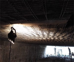 北洼東橋位于西三環(huán),此次大修對(duì)橋下梁、墩柱、蓋梁進(jìn)行修補(bǔ),并對(duì)橋下結(jié)構(gòu)進(jìn)行加固,以提高整體性和承載能力。墩柱修補(bǔ)采用環(huán)氧砂漿,加固采用不銹鋼鋼絞線(xiàn)網(wǎng)片+聚合物砂漿的方案加固。